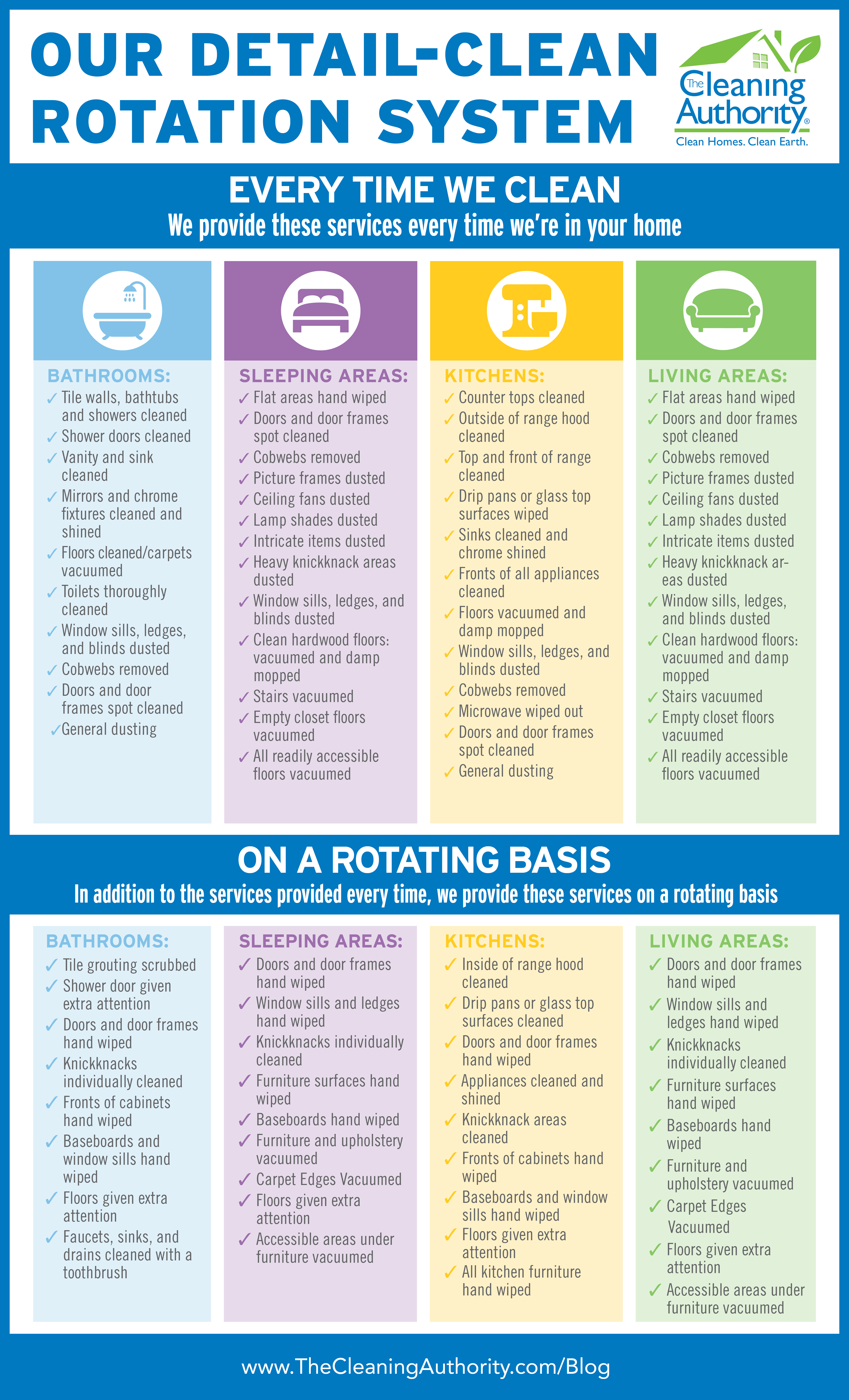At The Cleaning Authority, we use our Detail-Clean Rotation System to ensure that our customers are always receiving a high quality clean. Additionally, our House Cleaning Checklist is used to make sure our customers get a thorough clean every time and that nothing is missed.